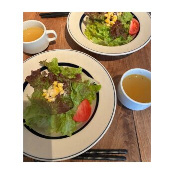 たっぷりのサラダと生姜の効いたコンソメスープ。これはまねできそう♪